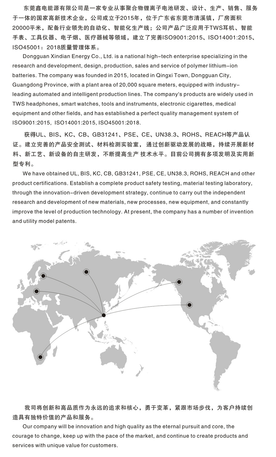 東莞鑫電能源有限公司是一家專業(yè)從事聚合物鋰離子電池研發(fā)、設計、生產(chǎn)、銷售、服務于一體的國家高新技術企業(yè),公司成立于2015年,位于廣東省東莞市清溪鎮(zhèn),廠房面積20000平米,配備行業(yè)領先的自動化、智能化生產(chǎn)線。